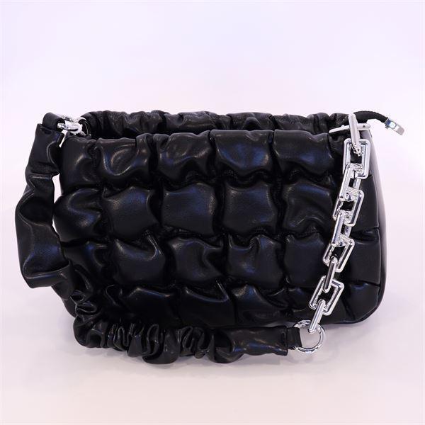 Небольшая, прямоугольная сумка дополнит стильный образ или станет акцентом. В нее помещаются ежедневные необходимые мелочи: телефон, кошелек, ключи, зарядное устройство, солнцезащитные очки, косметичка и многое другое. Изготовленная из эко-кожи черного цвета, сумка прослужит вам не один сезон. Основное отделение закрывается на замок-молнию. Оригинальная фактура – дутая простеганная мелкими квадратиками эко-кожа. Аксессуар дополнен оригинальной ручкой, где скомбинирована эко-кожа и металлическая цепочка.